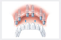 Auf mindestens sechs Implantaten kann auch eine Brücke dauerhaft an Ihrem Kiefer verankert werden. Der Zahnersatz sitzt dann so fest, dass auf den stützenden rosa Prothesenkunststoff verzichtet werden kann. Im Oberkiefer bleibt in jedem Falle der Gaumen frei von Prothesenmaterial.