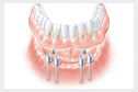 Wenn Ihnen im Unterkiefer fast alle oder sogar alle Zähne fehlen, haben Sie mit Implantaten trotzdem gut lachen. Denn schon zwei bis vier Implantate reichen aus, um einer Vollprothese festen Halt zu geben. Die Befestigung erfolgt mit speziellen Haltesystemen, die aus zwei Elementen bestehen. Eines wird dauerhaft auf die Implantate gesetzt, das Gegenstück in die Prothese eingearbeitet.
